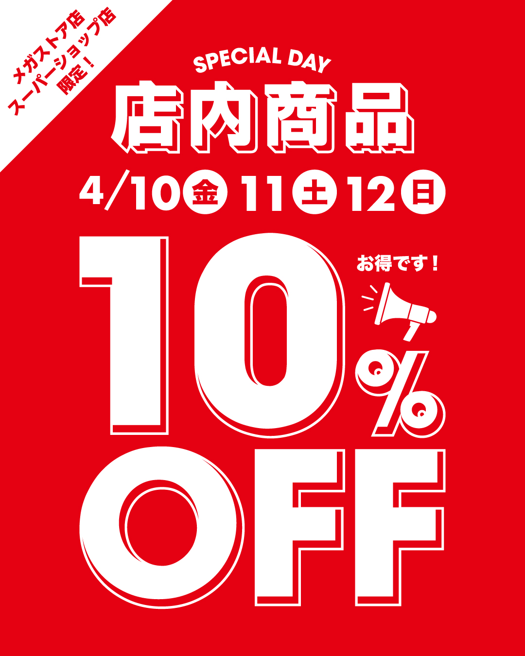 【4/10〜12まで!】メガストア,スーパーショップ店にて、店内商品10%OFF!BORN FREE SPECIAL DAYS開催!
